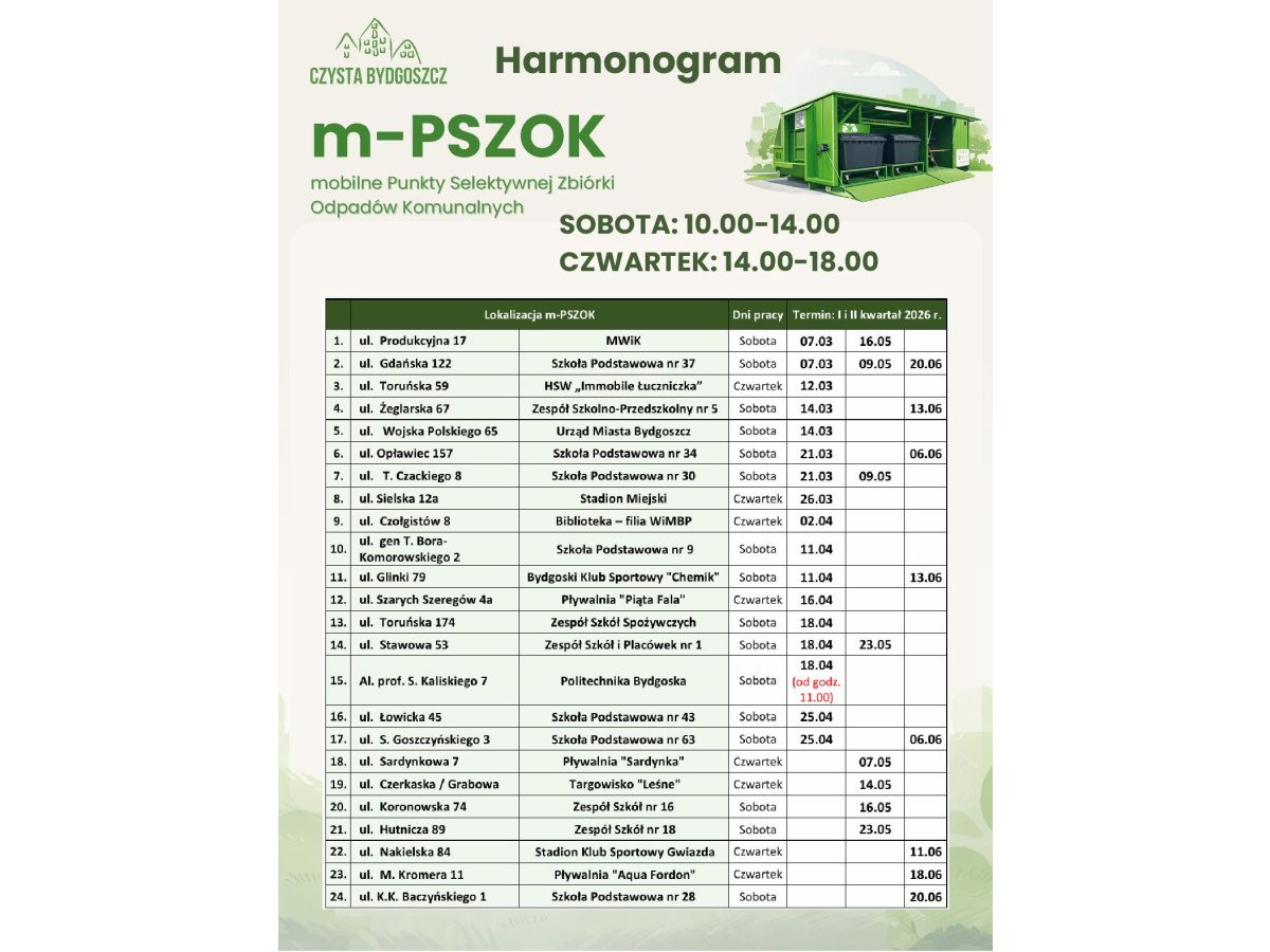 Szczegółowe informacje w serwisie: https://www.czystabydgoszcz.pl/aktualnosci/wpis/mobilne-pszok-pomoga-w-segregacji-odpadow-pytania-i-odpowiedzi