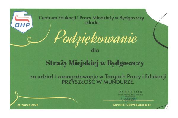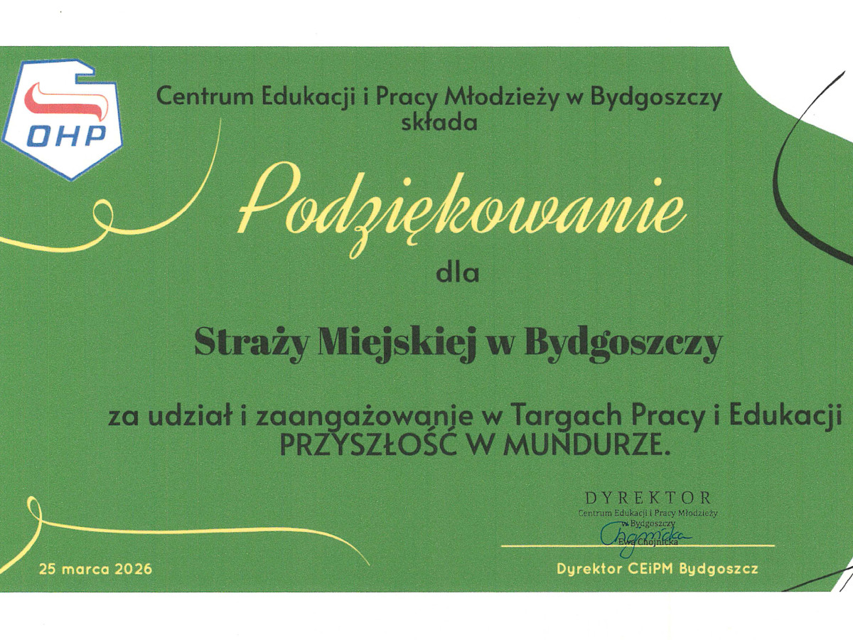 Straż Miejska w Bydgoszczy, oprócz codziennej służby patrolowej i działań związanych z szeroko rozumianym porządkiem publicznym i profilaktyką, od wielu już lat zaangażowana jest także w działania o charakterze społecznym. Kierowane do Straży podziękowania od instytucji, organizacji społecznych oraz osób prywatnych, są dla nas nie tylko potwierdzeniem właściwie ukierunkowanej aktywności, ale również dodatkowym bodźcem do dalszej działalności na rzecz mieszkańców naszego miasta.